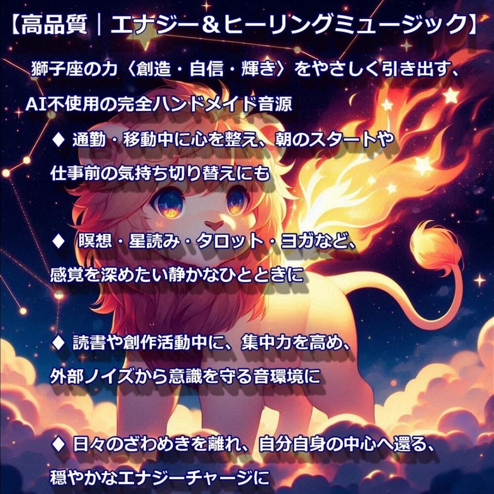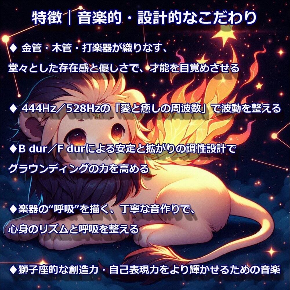 この楽曲は、獅子座が象徴する「創造性」「自己肯定」「情熱」「堂々たる輝き」を、音の響きで丁寧に描いた、完全オリジナルのヒーリングミュージックです。