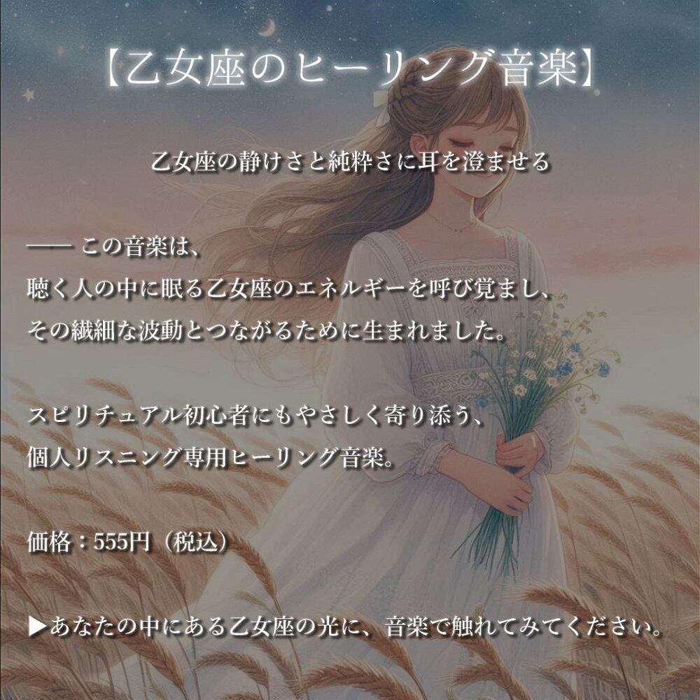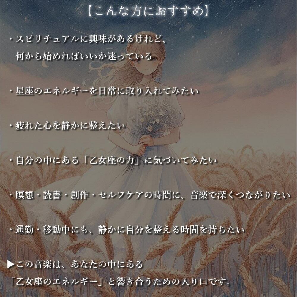 この楽曲は、乙女座が象徴する「浄化」「献身」「知性」「整える力」を、音の響きで丁寧に描いた完全オリジナルのヒーリングミュージックです。